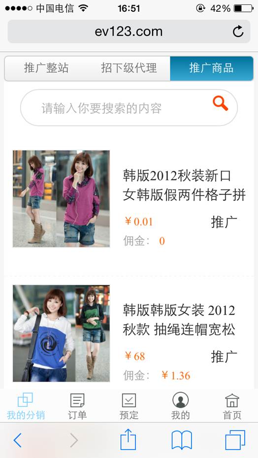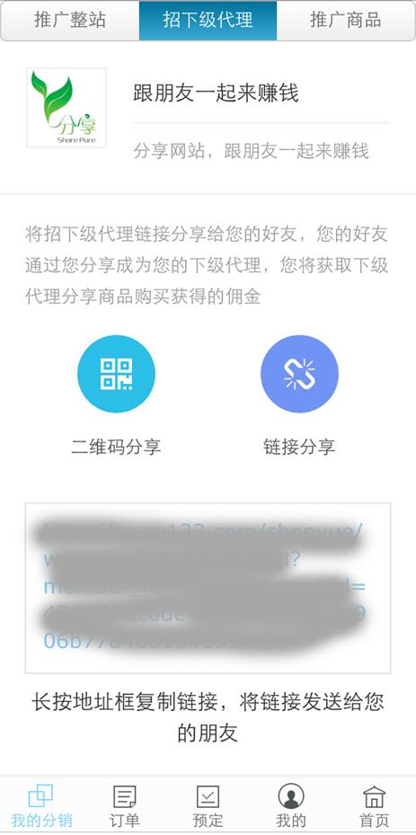 1. “推广获佣金”:会员可以分享整站链接,商品连接,可以发展下级代理的会员可以分享注册链接。如下图