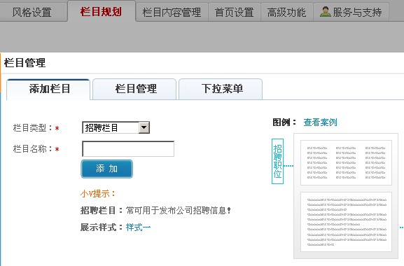 登陆您的网站管理后台,选择栏目规划,在选择新增栏目,选择招聘栏目增加即可,如图: