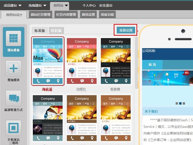 1、如何设置微网站背景?点击此处的背景设置!