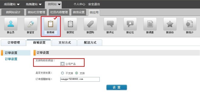 2、微商城设置(那些栏目开通购物车?订单邮件提醒,订单发票设置)