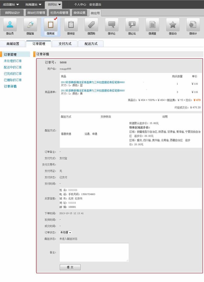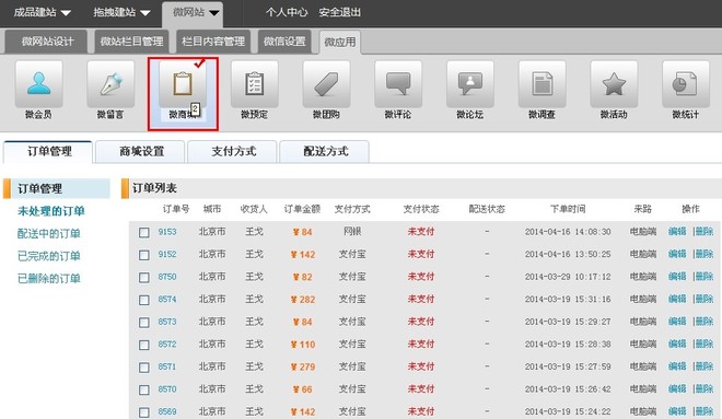 1、微订单管理(查看订单,订单编辑,订单状态设置,订单删除)