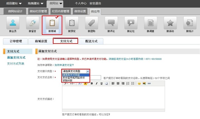注:订单查看及订单支付方式设置需升级微商城功能!