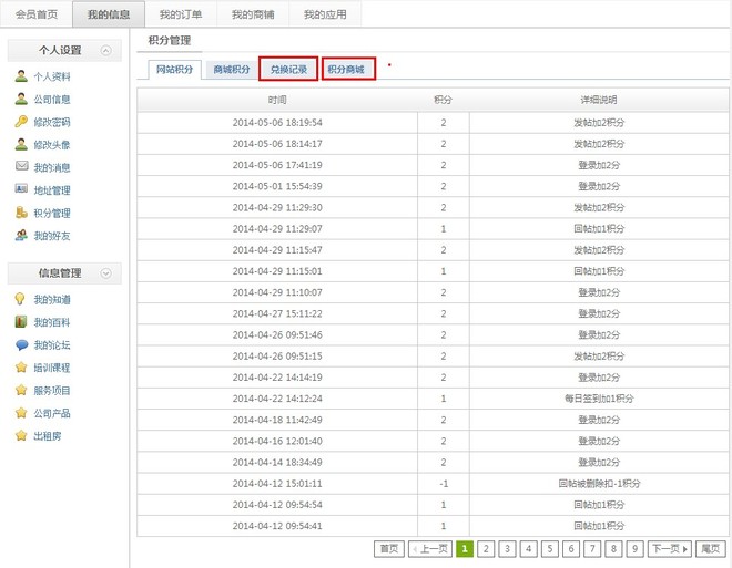 用户会员中心,查看积分及兑换