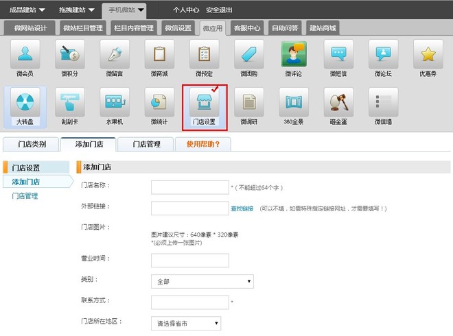 设置路径:管理后台->手机微站->微应用->门店设置