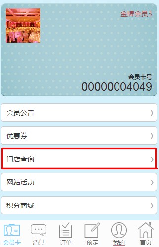 1、会员中心->会员卡->门店查询