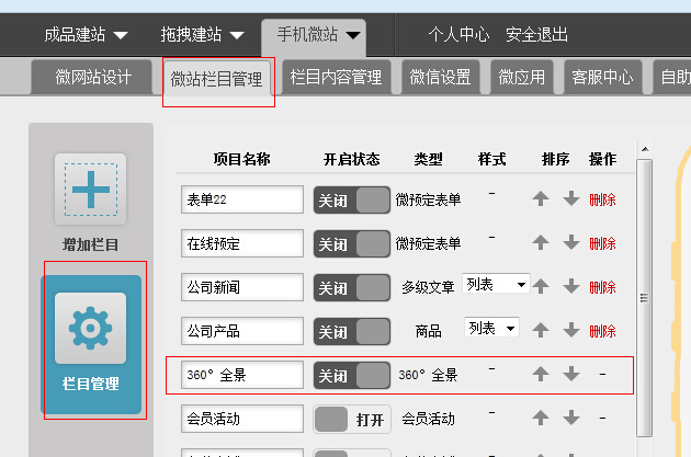 首先要确定您的360°全景是否在导航中是显示状态,“微站栏目管理”—》“栏目管理”确保是开启状态是才可以在微站首页显示哦,您也可以在这里更改您的导航名称,小编在这里就不更改了(如下图)