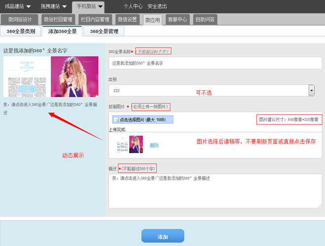(4)描述:简单的描述下您的360°全景图展示的是什么,或是吸引人的文字。为了在手机上显示的更美观您上传的图片最好为640*320像素。