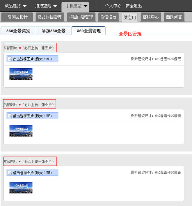 上面的一切准备都是为了要添加全景图片。按照页面上的提示上传您拍摄的照片,尺寸最好为(640*640像素)如果尺寸偏小的系统会自动放大来适配整个360°全景。