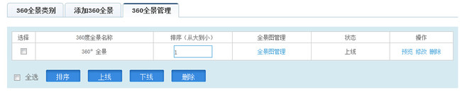 (1)排序:在排序框中填写数字来对您添加的多个全景进行排序(数字从大到小),在前台展示的时候也会按照“排序”进行显示。