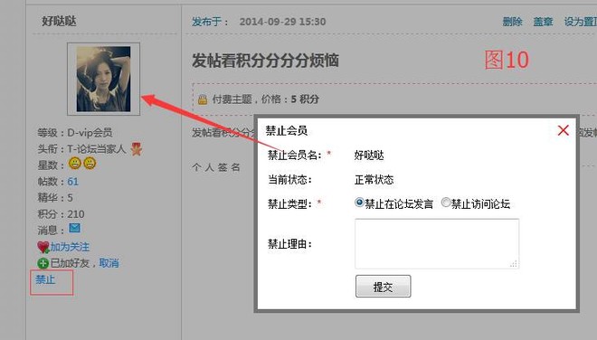 ÍøÕ¾Ç°Ì¨ÖйÜÀíÔ±ºÍ°æÖ÷Ò²¿ÉÒÔ¡°½ûÖ¹»áÔ±¡±£¬°æÖ÷ºÍ¹ÜÀíÔ±ÔÚǰ̨½ûÖ¹»áÔ±µÄʱºòÊÇÎÞ·¨Çå¿Õ¸Ã»áÔ±µÄÌû×Ӻͻظ´¡££¨Èçͼ10£©