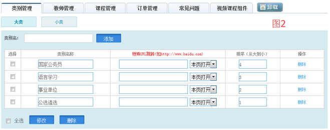 二、您可以设置视频课程的大、小类别可对类别进行“修改”、“外链”、“排序”和“删除”,清楚的区分不同的视频课程,简单明了便于查找。如图2