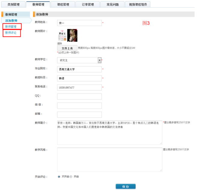 三、添加教师、开启教师的评论,您需要添加讲述视频课程的教师,教师的简介、学位、毕业院校、教授科目等。如图3