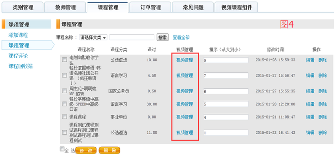 2、“课程管理”:当您添加完成视频课程的时候在“课程管理”中对课程和课程的视频进行操作。如图4