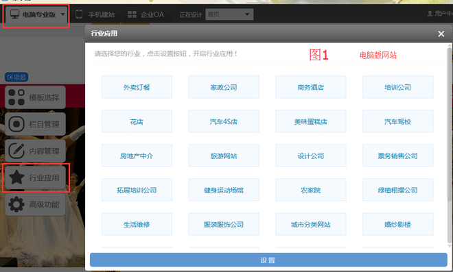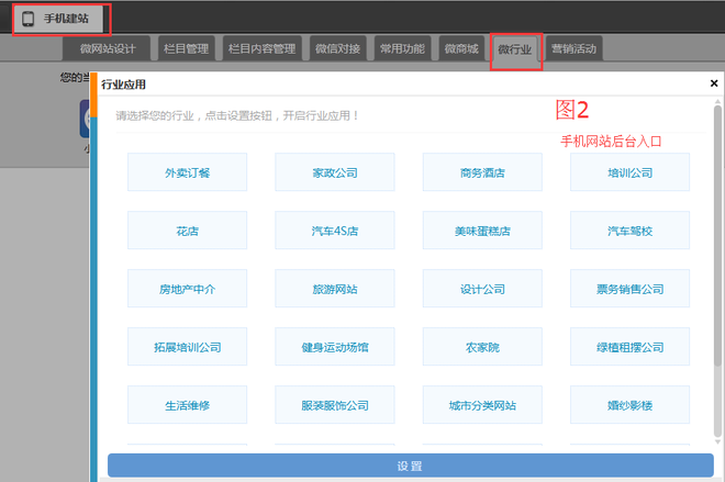 3¡¢ ÊÖ»ú°æÍøÕ¾ºǫ́ÖС°ÐÐÒµÓ¦Óá±µÄλÖ㬡°ÊÖ»ú½¨Õ¾¡±->¡°Î¢ÐÐÒµ¡±¡£Èçͼ2